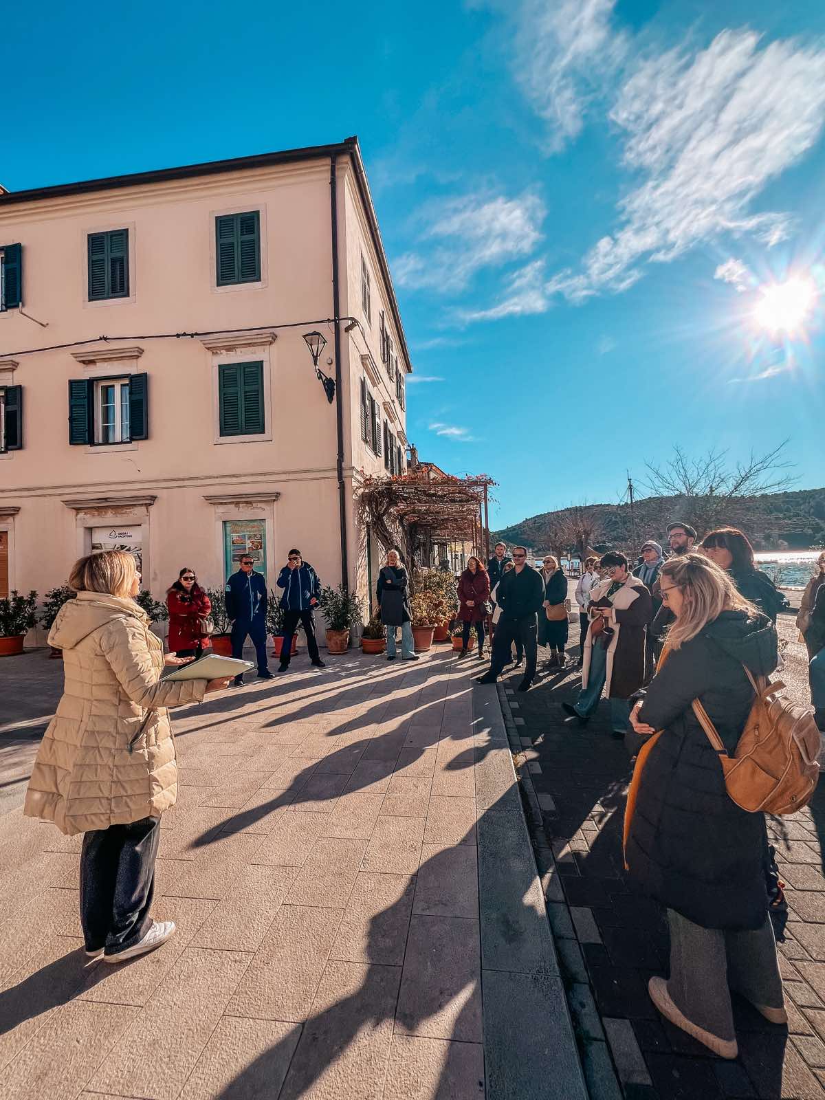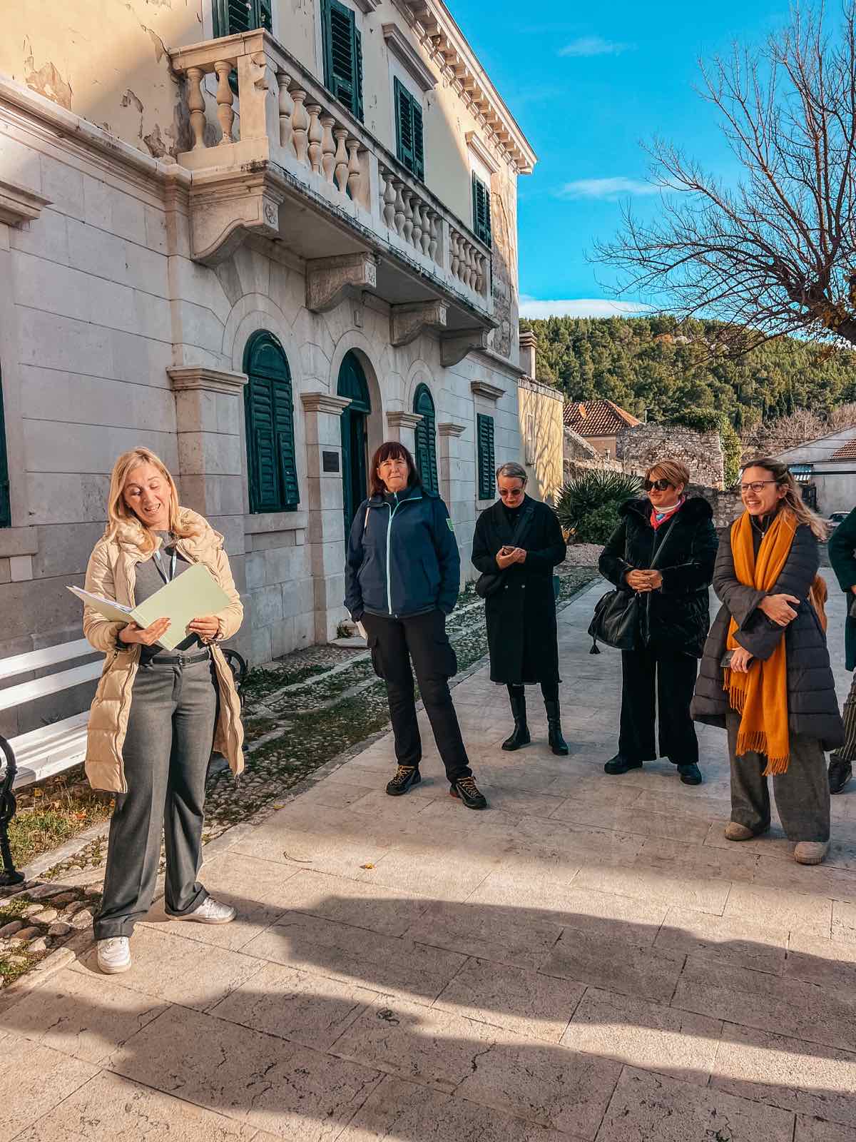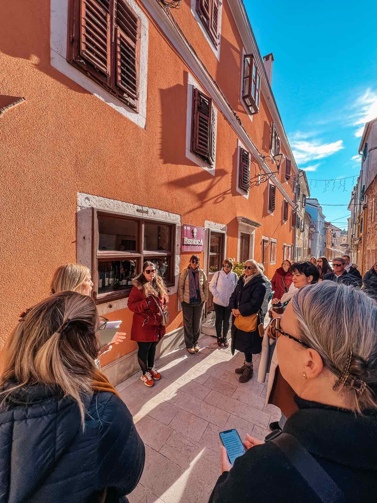 O poznatoj skradinskoj gostoljubivosti slušali smo ispred najstarije autohtone konobe u Dalmaciji, Konobe “Mate”, koja i danas djeluje kao prava mala vremenska kapsula. Martininu priču s prozora je pozorno pratila 96-godišnja vlasnica, gospođa Anka, koja je svojim komentarom simpatično “verificirala” autentičnost Martininih riječi – dodavši cijeloj sceni onaj poseban, topli skradinski štih. Nadaleko poznatu skradinsku gastronomiju Martina nam je približila kroz priče o tingulu od tuke, koprtljama, skradinskom rižotu i nezaobilaznoj skradinskoj torti. Uz gastronomiju ide i marendaška tradicija – čuli smo i nekoliko priča o skradinskom “marendaškom životu” i poznatim skradinskim bonkulovićima zabilježenima na starim fotografijama. Saznali smo i kakva su prava imale žene u Skradinu po Statutu iz 14. stoljeća, a najviše je pažnje – i laganog žamorom popraćenog odobravanja – privukla odredba da muževi nisu smjeli uzeti zajam bez znanja i dopuštenja supruge. Sudionici su duhovito primijetili da bi se takvo pravilo moglo “oživjeti” i danas.