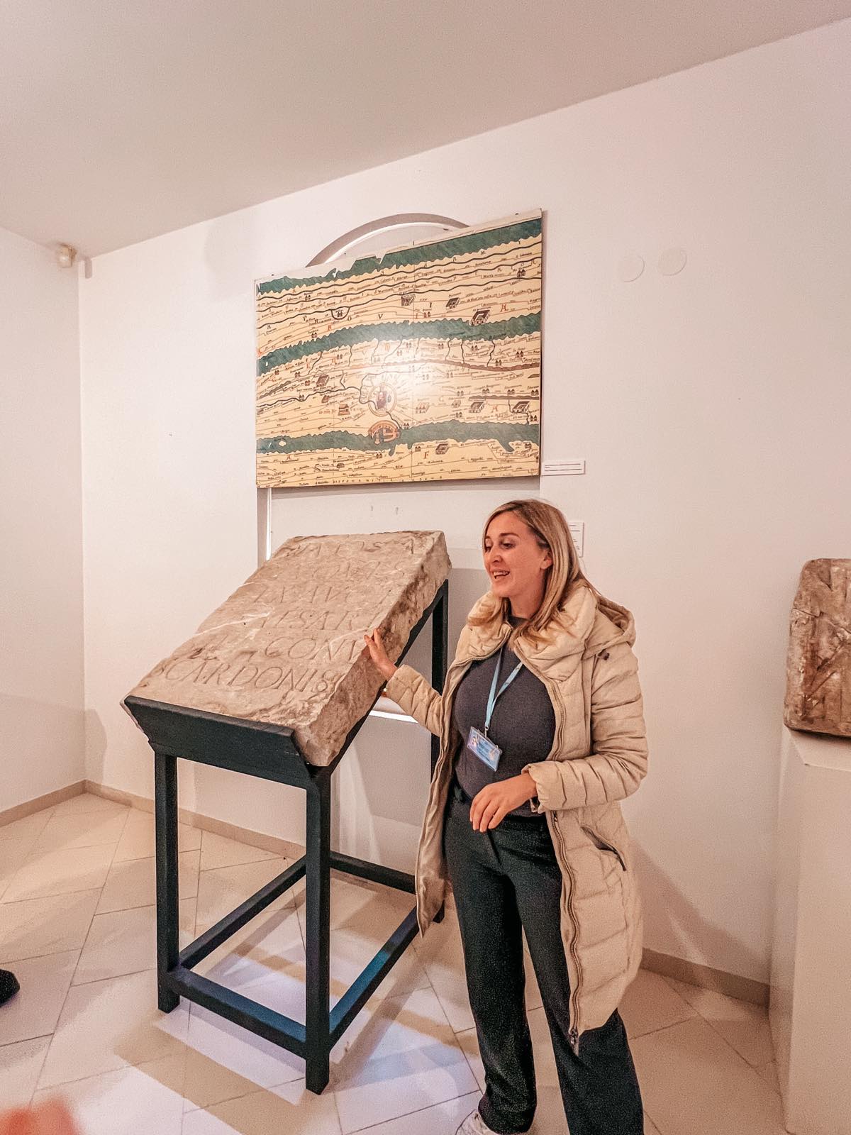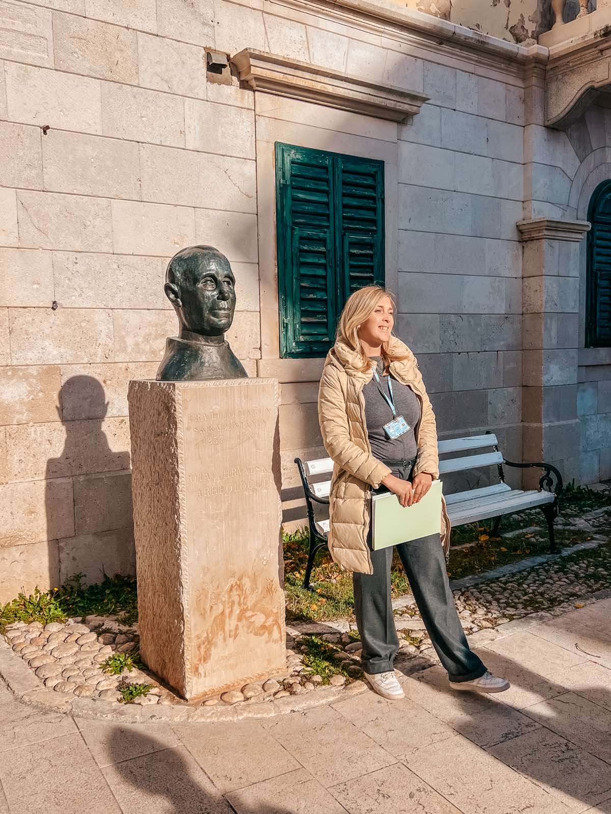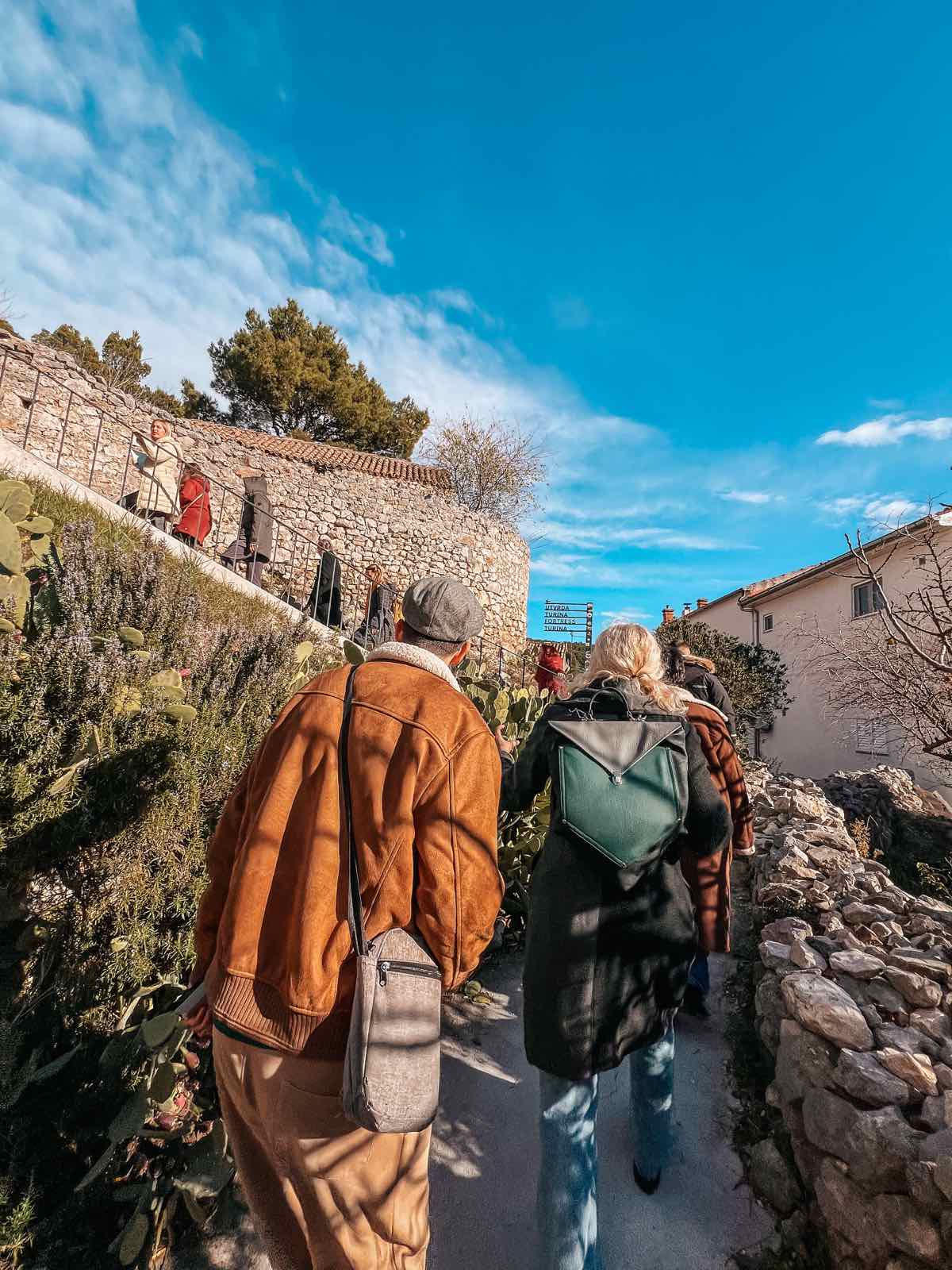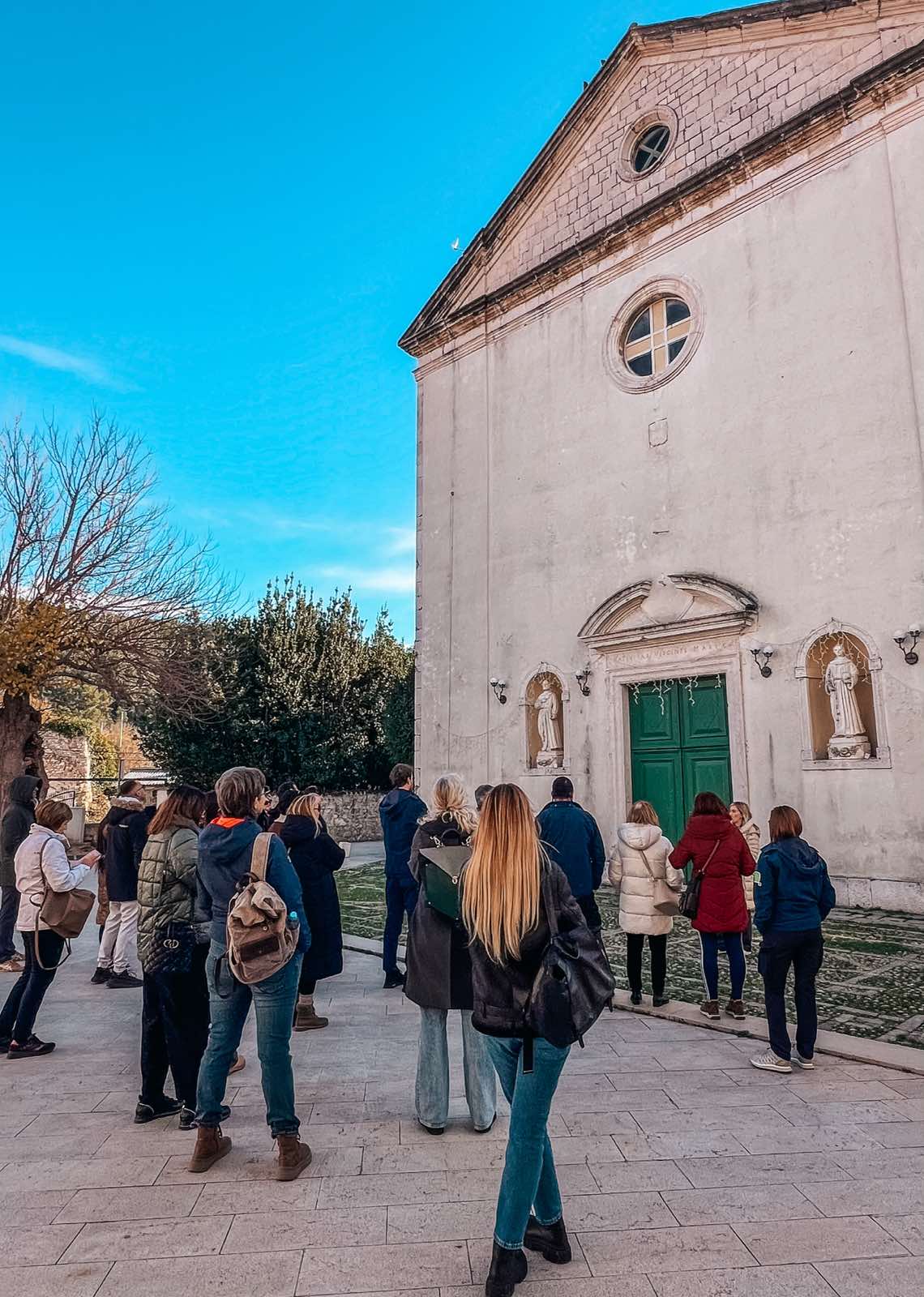 O poznatoj skradinskoj gostoljubivosti slušali smo ispred najstarije autohtone konobe u Dalmaciji, Konobe “Mate”, koja i danas djeluje kao prava mala vremenska kapsula. Martininu priču s prozora je pozorno pratila 96-godišnja vlasnica, gospođa Anka, koja je svojim komentarom simpatično “verificirala” autentičnost Martininih riječi – dodavši cijeloj sceni onaj poseban, topli skradinski štih. Nadaleko poznatu skradinsku gastronomiju Martina nam je približila kroz priče o tingulu od tuke, koprtljama, skradinskom rižotu i nezaobilaznoj skradinskoj torti. Uz gastronomiju ide i marendaška tradicija – čuli smo i nekoliko priča o skradinskom “marendaškom životu” i poznatim skradinskim bonkulovićima zabilježenima na starim fotografijama. Saznali smo i kakva su prava imale žene u Skradinu po Statutu iz 14. stoljeća, a najviše je pažnje – i laganog žamorom popraćenog odobravanja – privukla odredba da muževi nisu smjeli uzeti zajam bez znanja i dopuštenja supruge. Sudionici su duhovito primijetili da bi se takvo pravilo moglo “oživjeti” i danas.